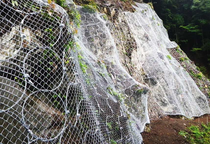 柔軟性を持ち、強度の高いリング型ワイヤロープを複数連結したモジュールを展開し、格子状に張り渡した縦・横ロープと連結し、交点付近にアンカーを設置し、転石・浮き石・剥離塊が落石にならないように初動を抑えます。